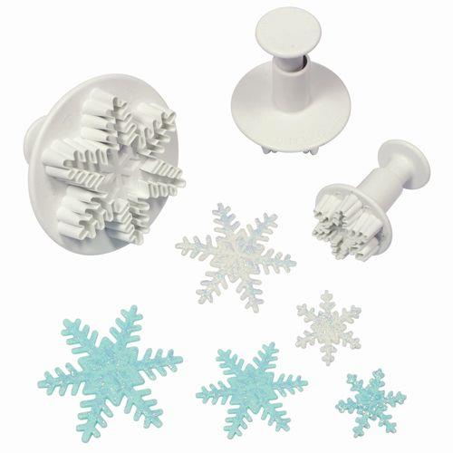 Set de 3 tamaños diferentes de cortadores con expulsor con formas de copos de nieve. Podrás realizar con estos cortadores preciosas escenas invernales, o dulces impresionantes con temática Frozen. Los cortadores con expulsor de PME tienen una calidad superior que permite que se realicen cortes en p...